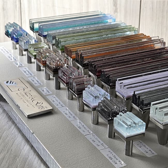 The display board showcases Jazz Long Pulls in our 6'' length. 11 pulls featuring all 11 curated glass colors. Colors: Aqua Marine - Bombay Blue - Clear - Garden Green - Golden Eyes - Love That Red - Mink - Purple Haze - Perfect Pink - Snow White & Stormy Black.